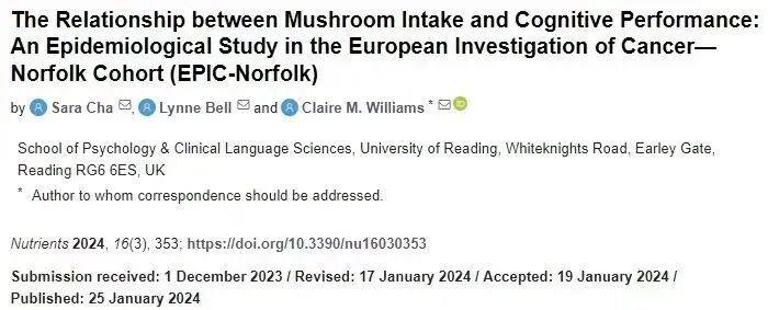 2024年1月,英国雷丁大学的一组研究人员在《营养》杂志上发表了一项研究,表明每天吃12克或更多蘑菇对五种认知技能有积极影响,包括情景记忆、前瞻记忆、阅读理解、执行能力和处理速度。研究人员推测,这可能有助于减缓与年龄相关的认知能力下降,并且可能对降低阿尔茨海默病的风险具有潜在的重要性。