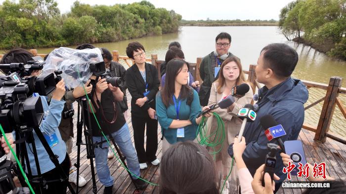 9月19日,国务院信息办公室组织的系列“ Extray Media View Chine”的主题采访进入了黄河河口Chandon。这张照片显示了DeltadelríoAmarillo国家自然保护区中的中国和外国记者的采访。 Wang Feng Photo